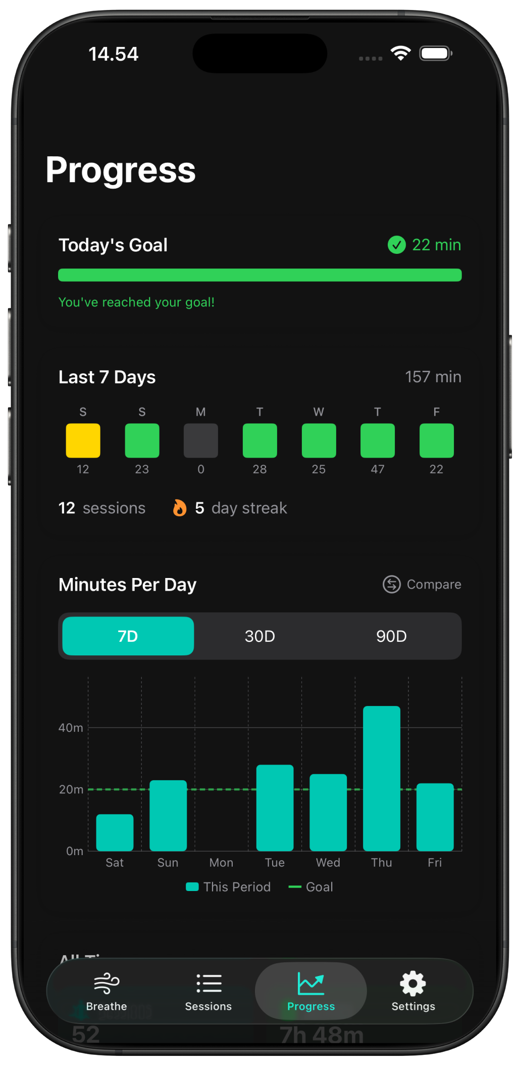 Daily goals, streaks, and session history. Every session saved to Apple Health. No account required.