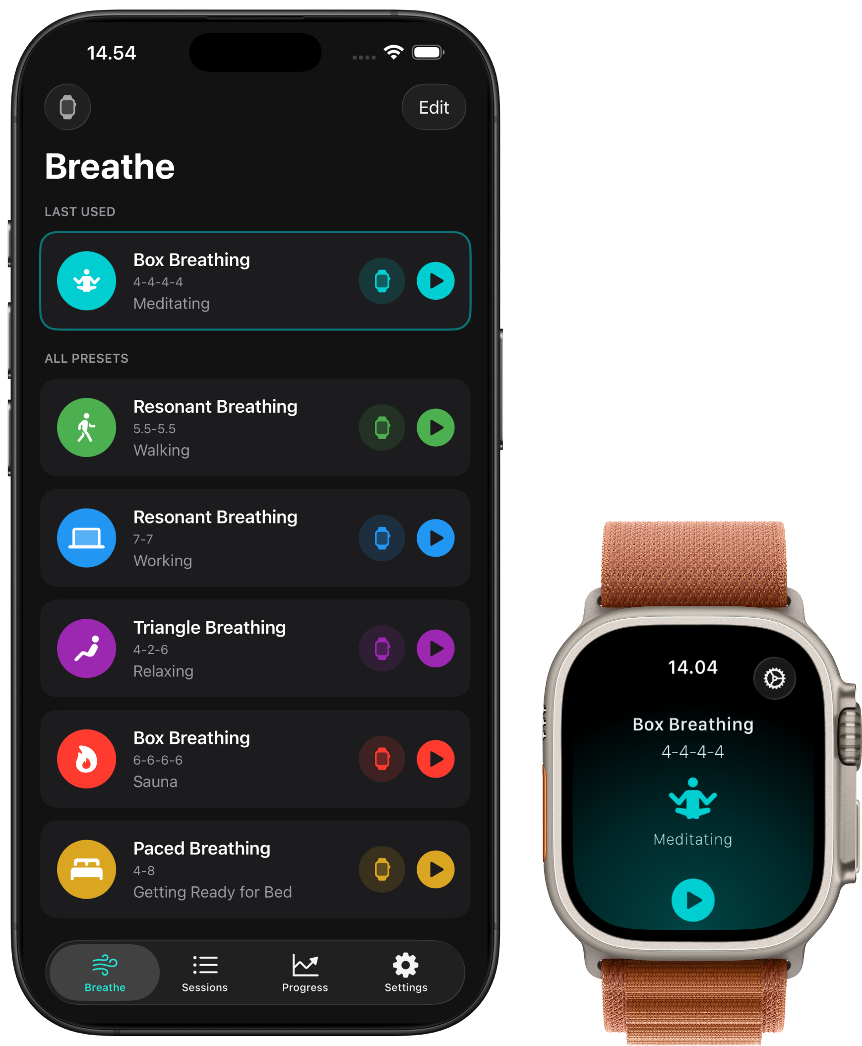 Walking, working, winding down. Each preset pairs a breathing technique with an activity, so you always have the right pattern ready. Pick one on your iPhone or Apple Watch and start breathing.